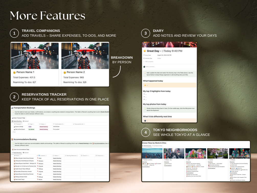 - Trackers for Everything: Vacation days, to-dos, packing, expenses, budget, transport, and more.